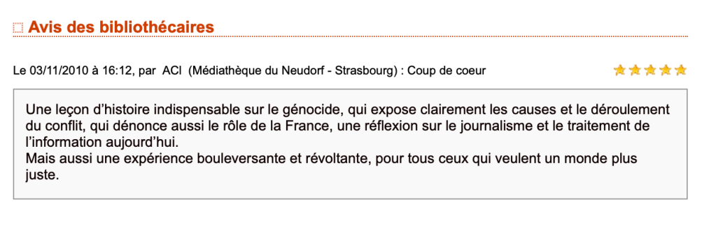 - Le comité de lecture ados de la médiathèque Maurice Delage à Honfleur : « Ce livre, qui se lit comme un roman, se veut pédagogique. Il nous marque autant que les livres-témoignages sur le génocide rwandais. Captivant, émouvant et nécessaire, ce petit roman accessible à tous est à mettre sur votre Pile À Lire absolument. »